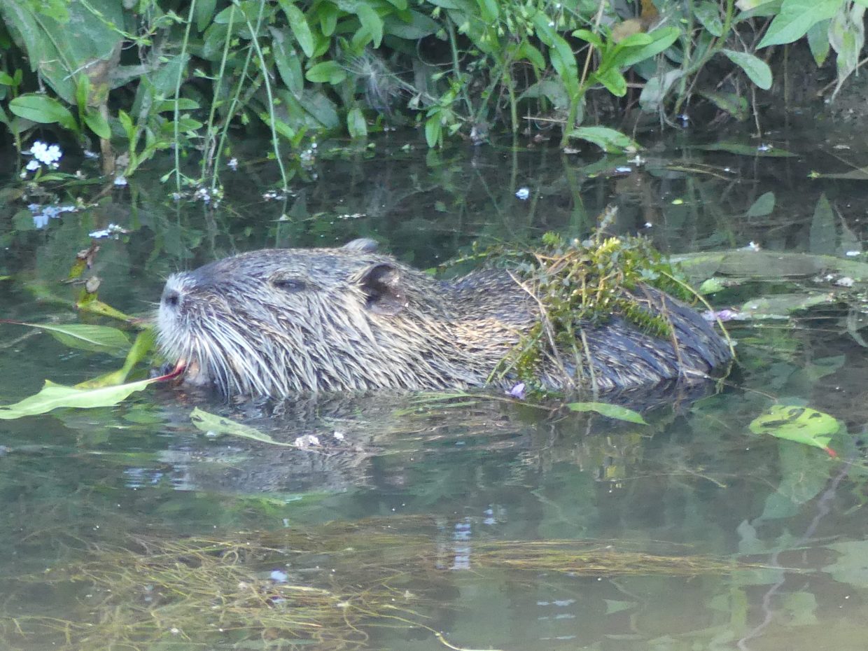 Nun ist er da! Nutria gibt es jede Menge am Kraichbach und im Juli 2020 wurde er nun auch im HÖP-Gelände gesichtet. Der anpassungsfähige Pflanzenfresser bewohnt die Ufer von Flüssen, Seen, Teichen und Sümpfen, fühlt sich aber auch in städtischen Grünanlagen wohl. Die pelzigen Gesellen sind auch schon mit Bibern verwechselt worden, die gibt es am Kraichbach aber nicht. Die Nutria (Myocastor coypus) sind putzig, wirken immer eifrig geschäftig, wenn sie Baumaterial für ihre Nester herbeischleppen oder ihre Jungen spazierenführen, denn sie können sich das ganze Jahr über fortpflanzen. Das Nagetier ist ursprünglich in Südamerika beheimatet und erreichte Europa als Zuchttier für Pelztierfarmen ab dem letzten Drittel des 19. Jahrhunderts. Von dort gelangte es in die Freiheit und wurde erstmals in den 1930er Jahren frei lebend nachgewiesen. Mittlerweile hat sich die Nutria in ganz Deutschland und Mitteleuropa etabliert. Das ist nicht ganz so lustig wie das Erscheinungsbild der Tierchen, denn sie graben sich zum Teil meterlange Röhrensysteme mit Wohnkesseln im Uferbereich oder in die Deichböschungen hinein. Das kann die Ufer ins Rutschen bringen oder Deiche unterminieren, wenn es zu viele Tiere in einem Gebiet gibt. Außerdem können sie bestimmte Krankheiten wie Toxoplasmose übertragen. Daher soll man Nutria auf keinen Fall füttern!