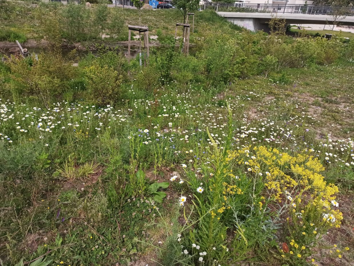 Hier wird nicht gedüngt und idealerweise auch nicht bewässert. Nur zweimal im Jahr wird gemäht. So entwickelt sich mit der Zeit eine nachhaltige Vegetation.