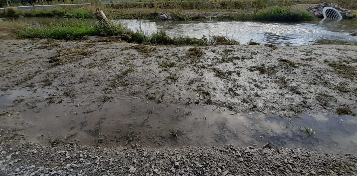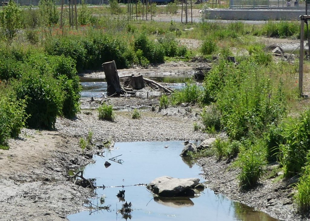 Vor allem bei starkem Regen, der aufgrund des Klimawandels ja zunimmt, sprudelt das Wasser auch aus den Überläufen der Kanalisation. Das liegt unter anderem daran, dass im städtischen Umfeld immer mehr Flächen versiegelt sind, so dass das Wasser nicht mehr versickern kann. Eindrücke aus dem August zeigt der Beitrag “Das erste Hochwasser?”