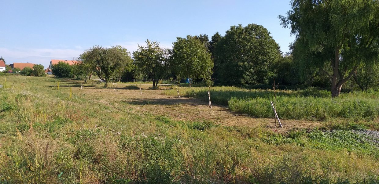 Einige alte Obst- und Walnußbäume standen schon da, nun wurden noch ein paar neue Apfel- und Birnbäume gepflanzt. Hier könnte eine Streuobstwiese entstehen. Die besten Informationen zu Streuobstwiesen, ihrer kulturellen und ökologischen Bedeutung hat das Carl-Friedrich-Gauß-Gymnasium zusammengetragen: Streuobstwiesen.
