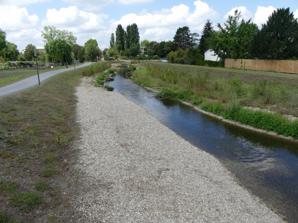Auf der anderen Seite erstreckt sich eine der Kieszonen des Kraichbachs. Das ist kein Badestrand, sondern eine der Laichzonen für Fische. Der Wirtschaftsweg auf der anderen Seite des Kraichbachs wird sich mit der Zeit zum Rückzugsort der Natur entwickeln. Hier sollen sich Pflanzen und Tiere wohl fühlen und Schutz finden.