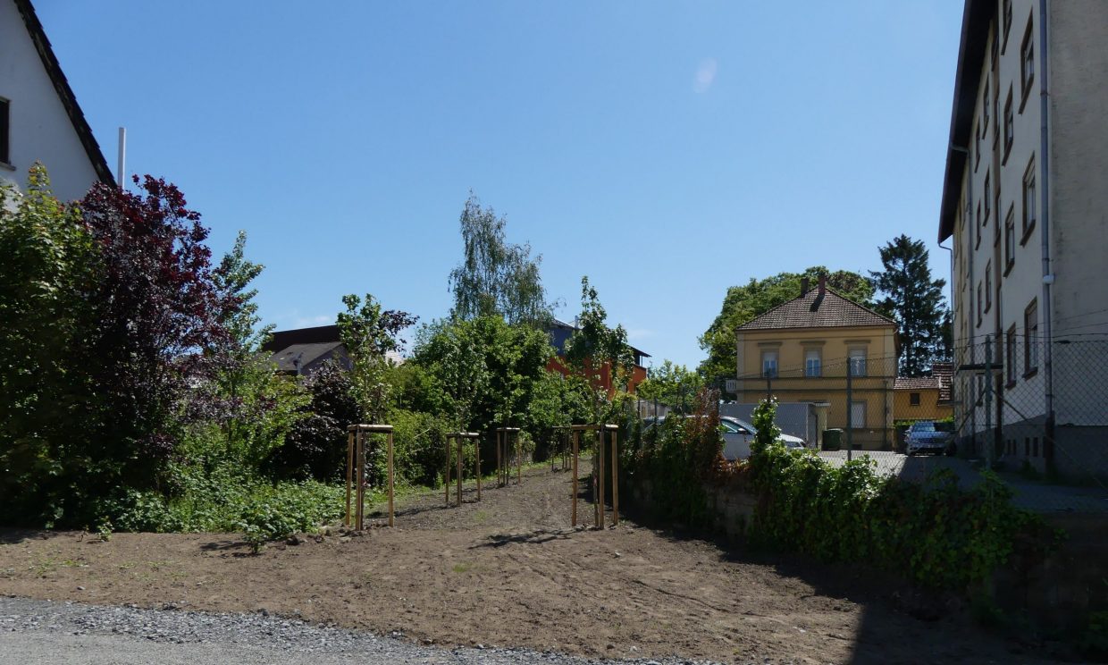 Es geht weiter, links über die Brücke und durch die Obere Mühlstraße, dann hinter den Häusern wieder links, zurück auf das HÖP-Gelände. Auf dem Weg in Blickrichtung links sieht man eine Baumpflanzung in gerader Linie zwischen den Häusern: Hier floss einmal der Kraichbach hindurch. Er wurde verfüllt und die Fläche mit Einzelbäumen bepflanzt.