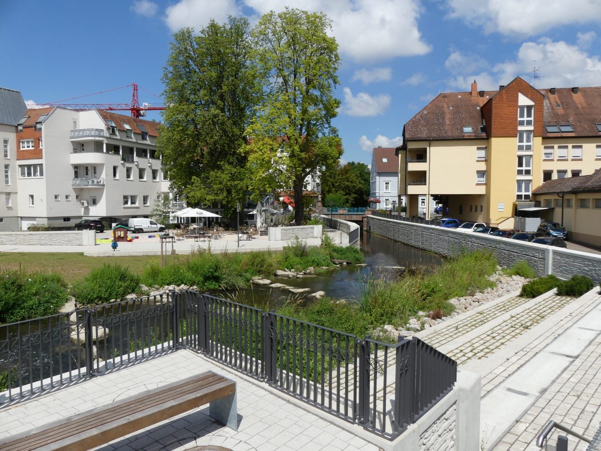 Apropos Rauschen des Wassers: An der Kraichbachterrasse befindet sich die sogenannte Sohlgleite. Da zwischen Messplatz und Zehntscheune ein Abwasserkanal quert, musste die Gewässersohle erhöht und der Höhenunterschied ausgeglichen werden, damit die Fische passieren können. Dazu wurden die Querriegel aus dicken Steinen eingebaut, die das Wasser bremsen und Lücken lassen für die großen Barben. Dadurch entsteht das schöne Rauschen des Wassers, das an vergangene Zeiten erinnert, als die Bäche noch munter waren und dahinplätscherten.